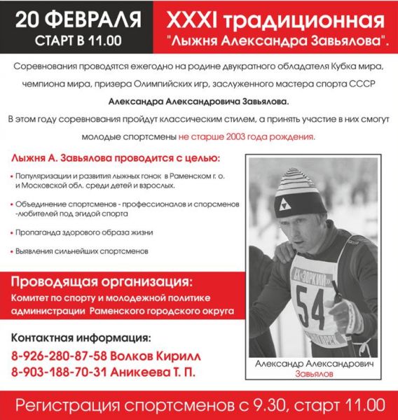 Лыжня Завьялова традиционно собирает на старт сотни лыжников. Соревнования проводятся уже 32 год подряд, и за эти годы лыжня Завьялова стала известна во всей России. Здесь пробуют свои силы не только взрослые спортсмены, но и самые юные. Каждый из них готовился к соревнованиям и слушал наставления тренеров перед стартом. В лыжной гонке участвуют и те, кто любит спорт. Это, прежде всего, и здоровье и образ жизни. Несмотря на теплую погоду на участие заявились 570 спортсменов, среди них 222 лыжника из Раменского г.о. Стоит отметить, что старты проходили и в поддержку наших олимпийских лыжников. А к моменту начала соревнований стало известно, что лыжник Александр Большунов выиграл масс-старт на Олимпиаде, став трехкратным олимпийским чемпионом!