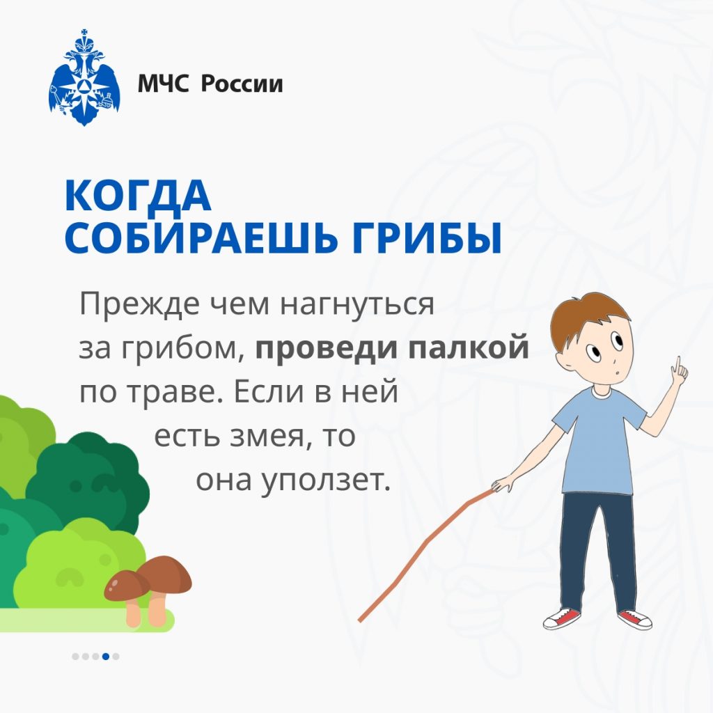На природе защищайте ноги и осматривайтесь перед тем, как присесть. Если заметили змею, замрите и дайте ей уйти. Не делайте резких движений и не пытайтесь трогать её руками. Если змея угрожает, медленно отступайте.